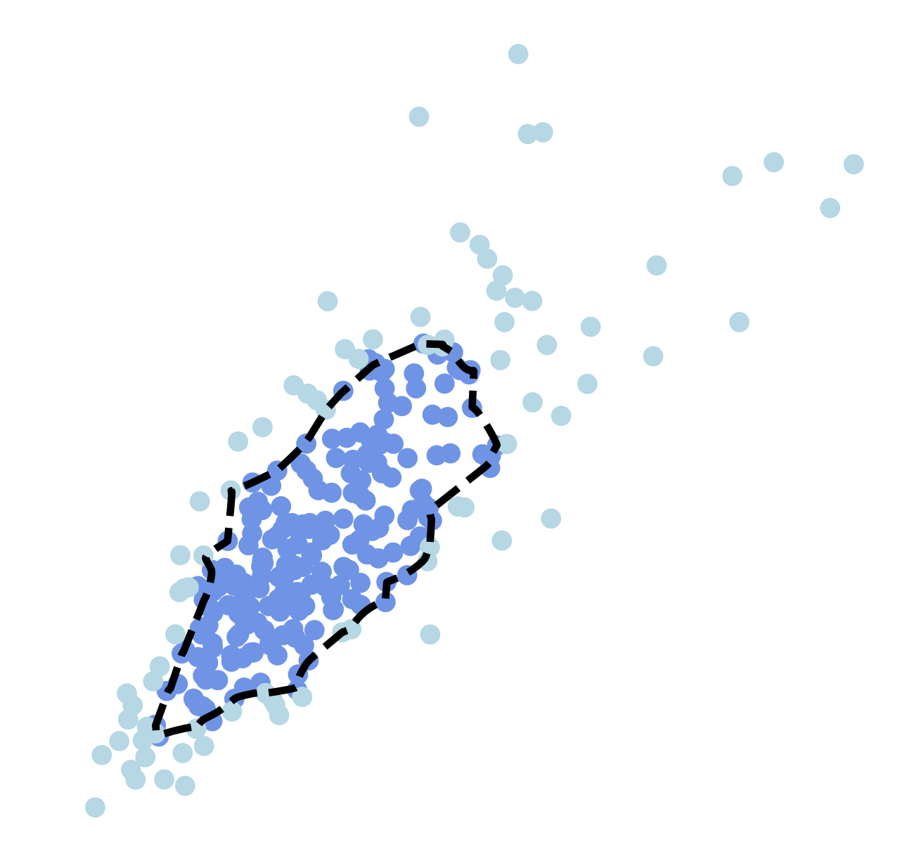 • A quantile contour (in blue) gathers vectors within a point cloud having the same depth, in all possible directions.