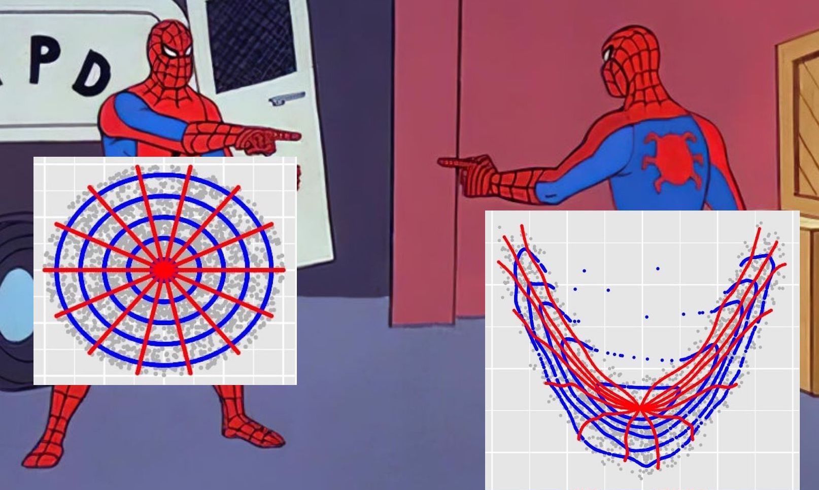 There, one can view the right-hand picture as a curvilinear polar coordinate system adapted to the shape of a distribution, which is broken down into two components :